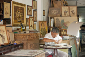 Và một trong số đó có thể kể đến chính là họa sĩ Nguyễn Trung Kỳ, người được mệnh danh là “cha đẻ của nghệ thuật marquetry Việt Nam”. Ông đã có hơn 40 năm kinh nghiệm trong lĩnh vực này và là tác giả của nhiều tác phẩm marquetry nổi tiếng, trong đó có bức tranh “Vịnh Hạ Long” có kích thước 1,2×1,5m với gần 2.000 chi tiết.